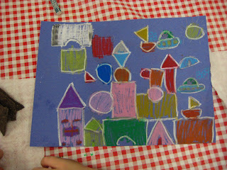 Marc Chagall's "I and The Village" painting was our source of inspiration this week. They started out by sketching an "X" across the entire sheet of paper. The children next were to draw a profile of a person on one side, and a profile of an animal/creature on the opposite side. In the corresponding areas the kids were to draw something the person dreams about, and in the last section something the animal dreams about. We had them use crayons this time for the assignment and encouraged them to fill in the entire "canvas". We tried to keep our "guidelines" to a minimum so they could really create their own dreamlike picture. Once they were finished we helped them mount their creation on solid color paper, and had them title, date, and sign their artwork.